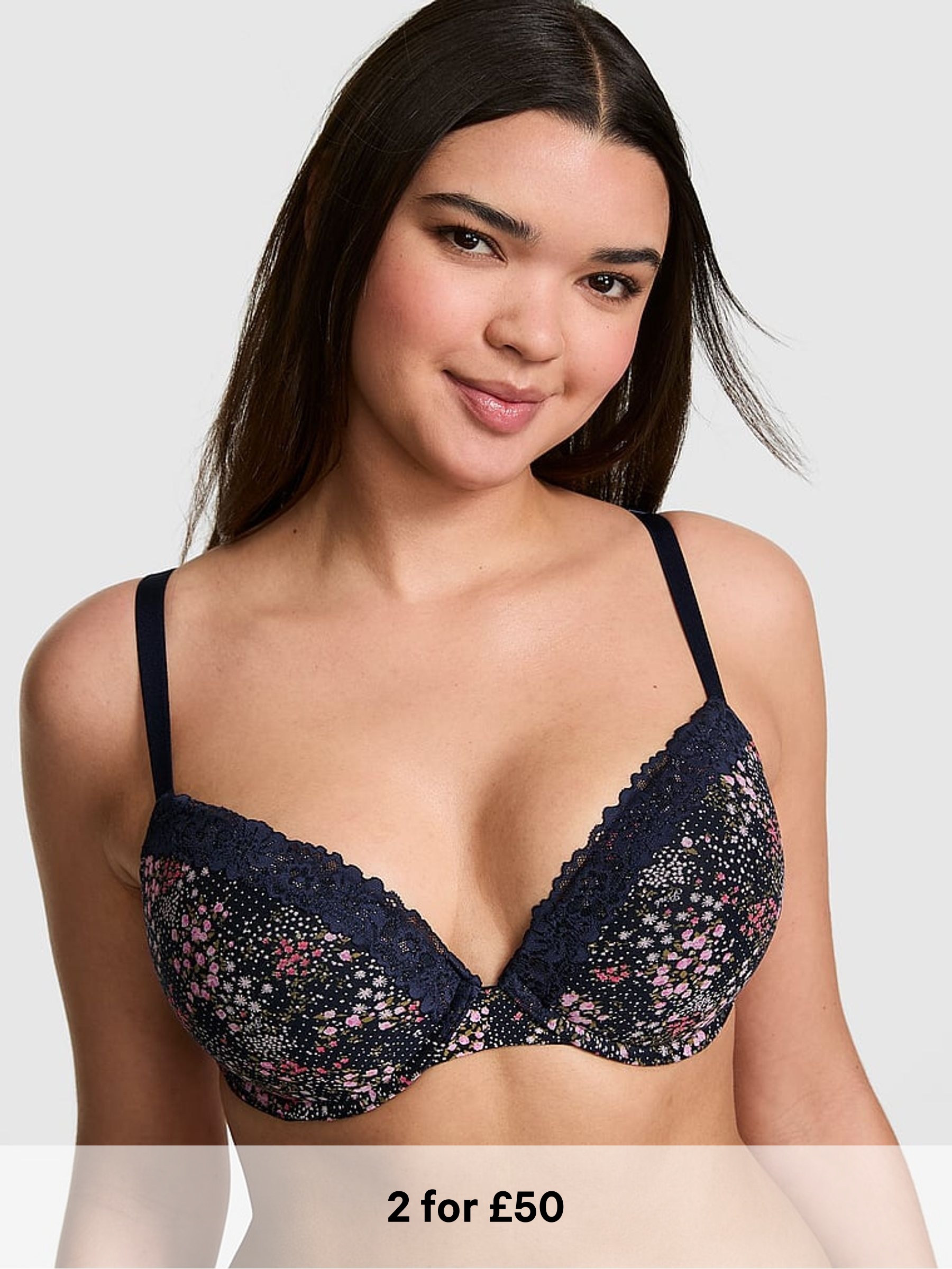 Noir Navy Blue Floral Print Super Push Up Cotton Heather Lace Trim Bra