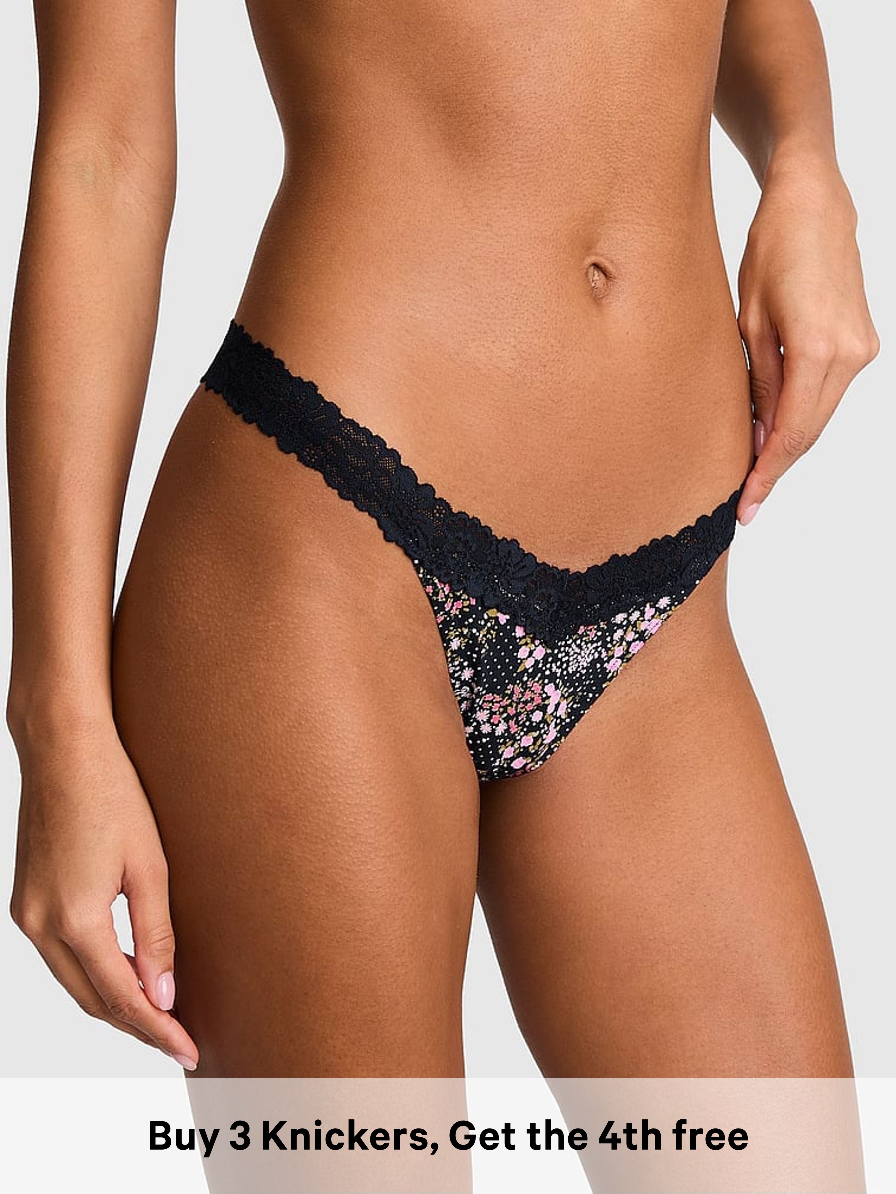 Noir Navy Blue Floral Print Thong Cotton Heather Lace Trim Knickers
