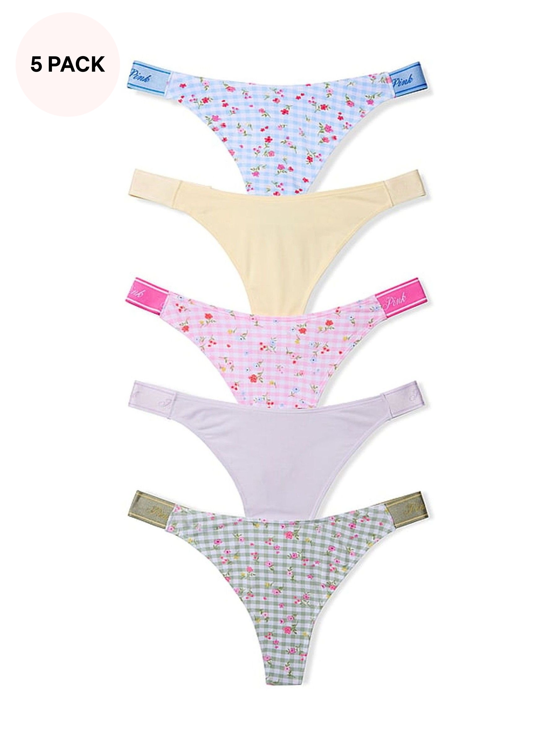 Pink/Yellow/Green/Purple/Blue Floral Print Thong 5 Pack Logo Knickers