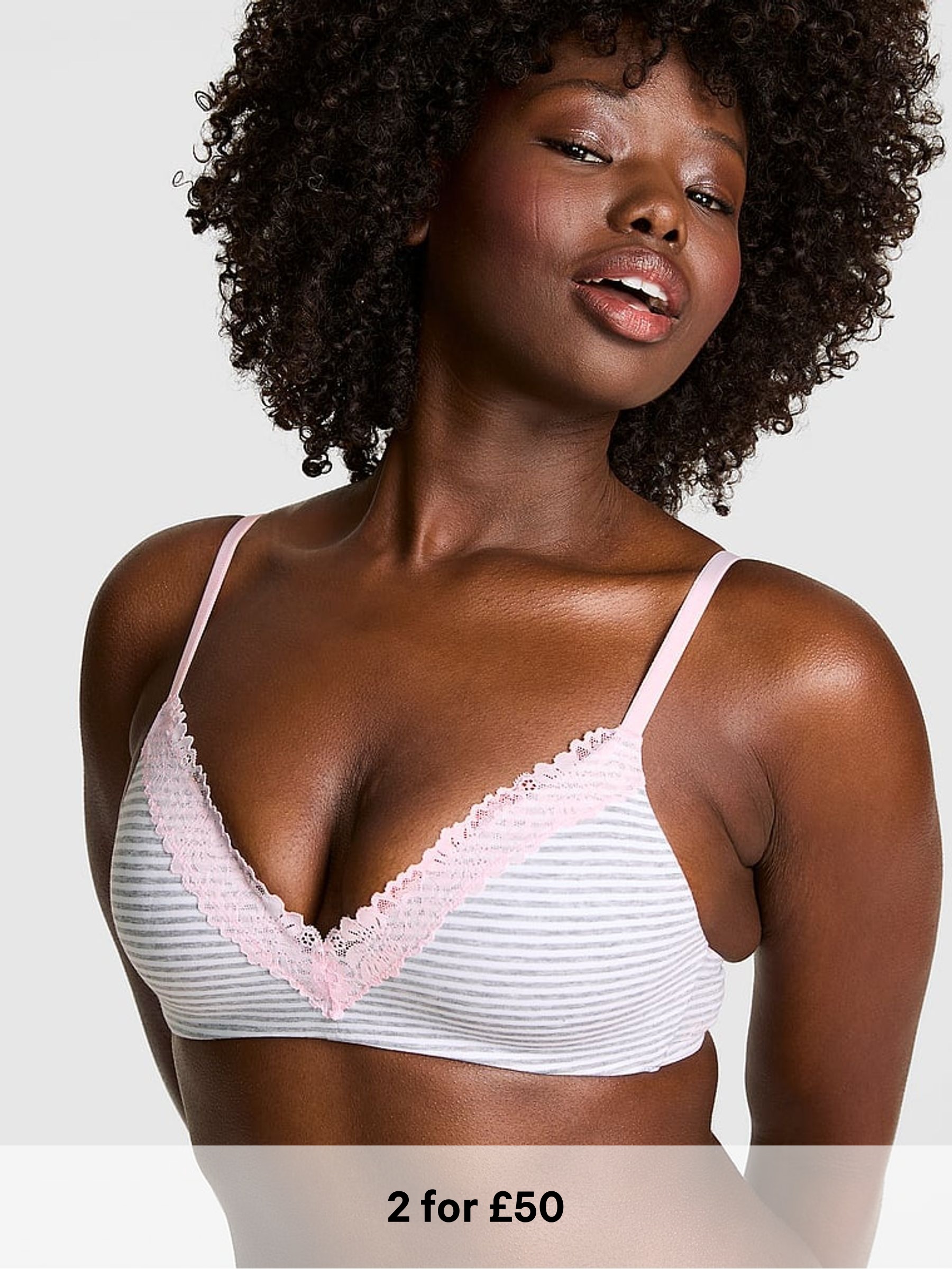 Grey Stripe Print Non Wired Lightly Lined Cotton Heather Lace Trim Bra