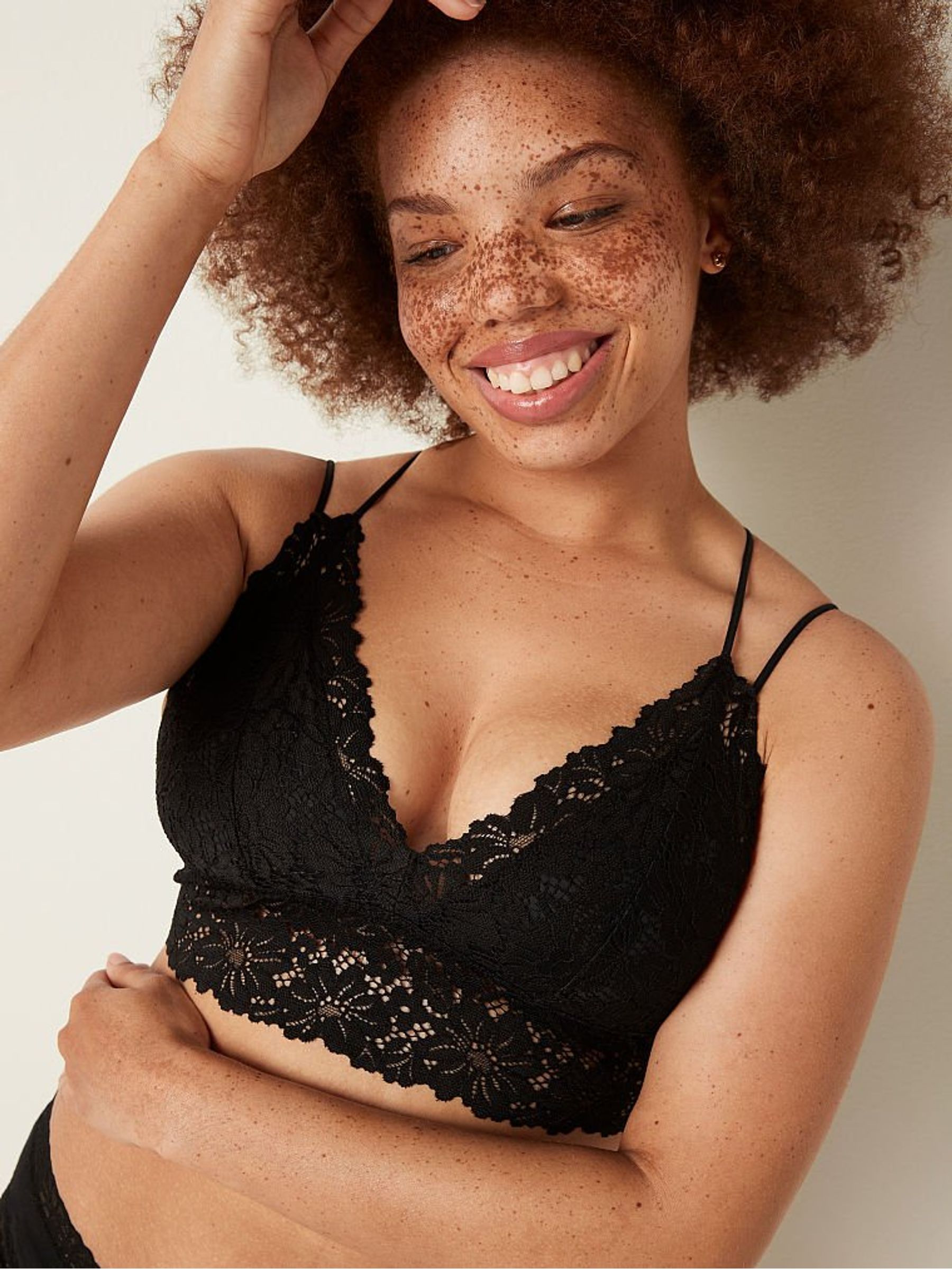 Allover lace fabric Removable padding Adjustable strappy back Smocked back detail Pull-on style Wireless long line Imported Body: 71% recycled poly 23% poly 6% elastane Lining: 85% polyamide, 15% elastane Cookie pocket: 84% polyamide, 16% elastane.