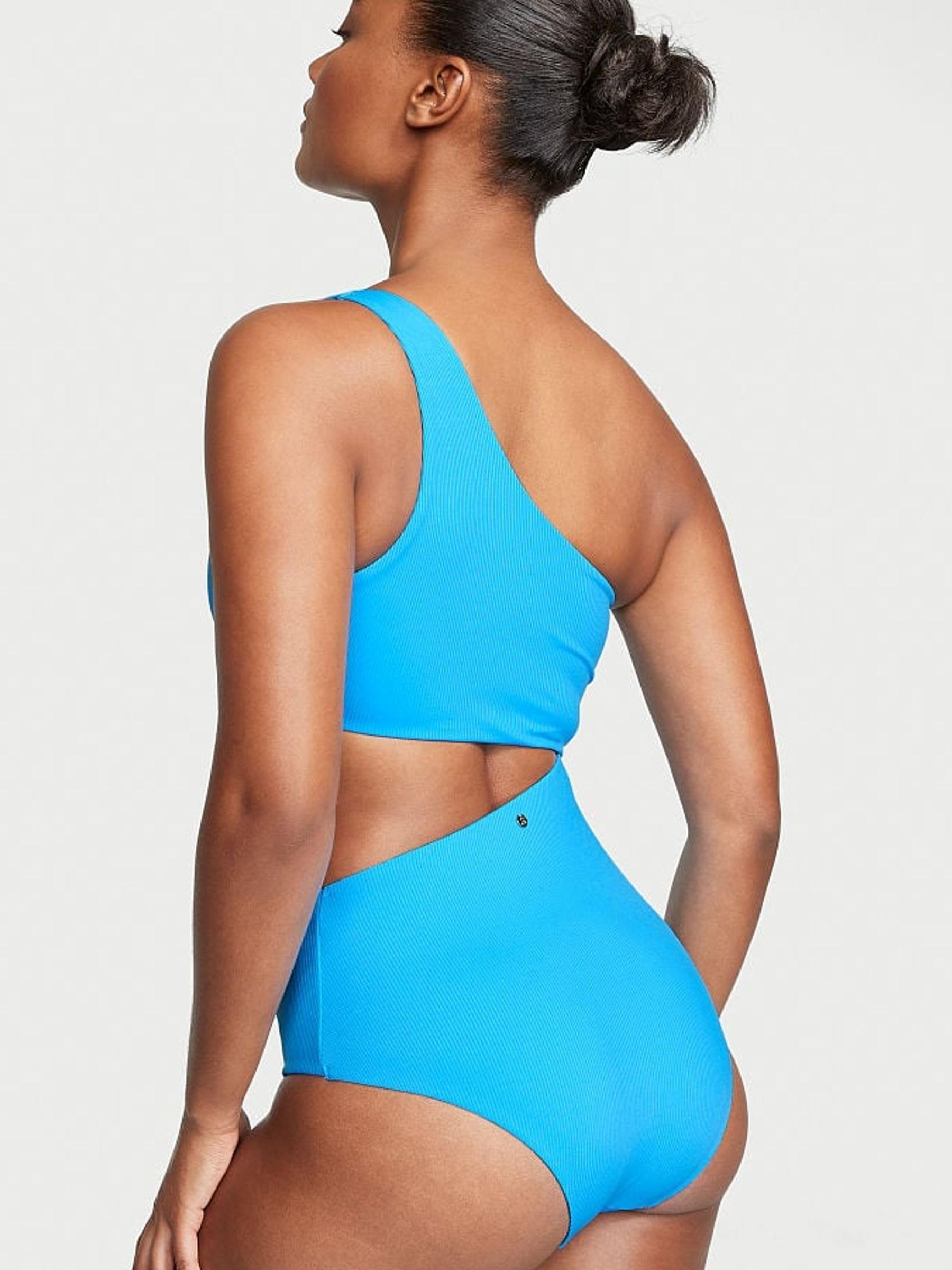 A simple and elevated design perfect for the beach, in a comfy ribbed fabric that skims your curves. Featuring a flirty waist cutout and one-strap design. Lightly lined with removable padding. Wireless. One shoulder strap. Waist cutout detail. Bikini fit: fully covered with minimal cheek peek.