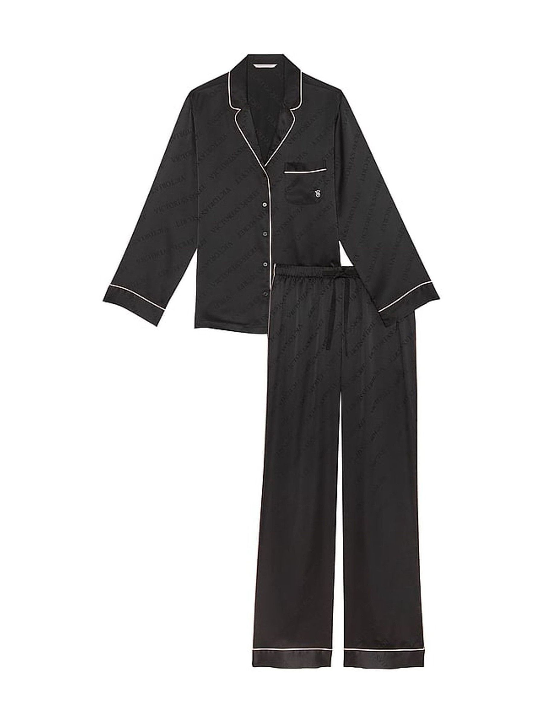 Now entering sleep mode. Wind down in this satin trousers and matching long-sleeve top with a chest pocket, notch collar, and decorative piping. Short: 29'' inseam, Regular: 31'' inseam, Long: 33'' inseam. Includes top and bottom Easy fit Long-sleeve, button-front top hits below hips Chest pocket with embroidered logo Trousers with drawstring waist Machine washable. 100% Polyester.