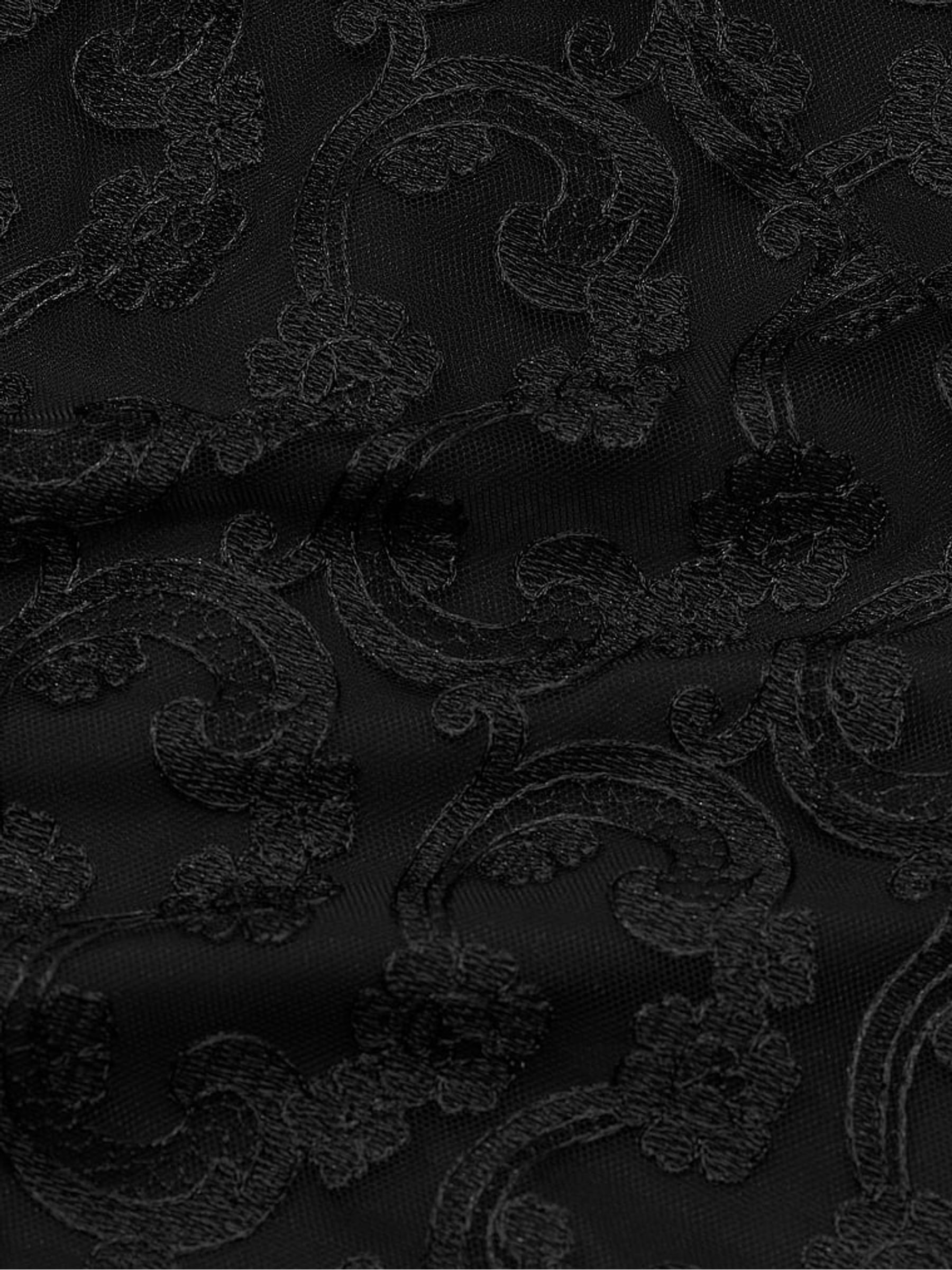 Exude effortless elegance with this lavishly embroidered slip. Thin straps create the shoulder-baring halter neckline and dramatic lace-up back andlacy trim complete this sheer mini style.
